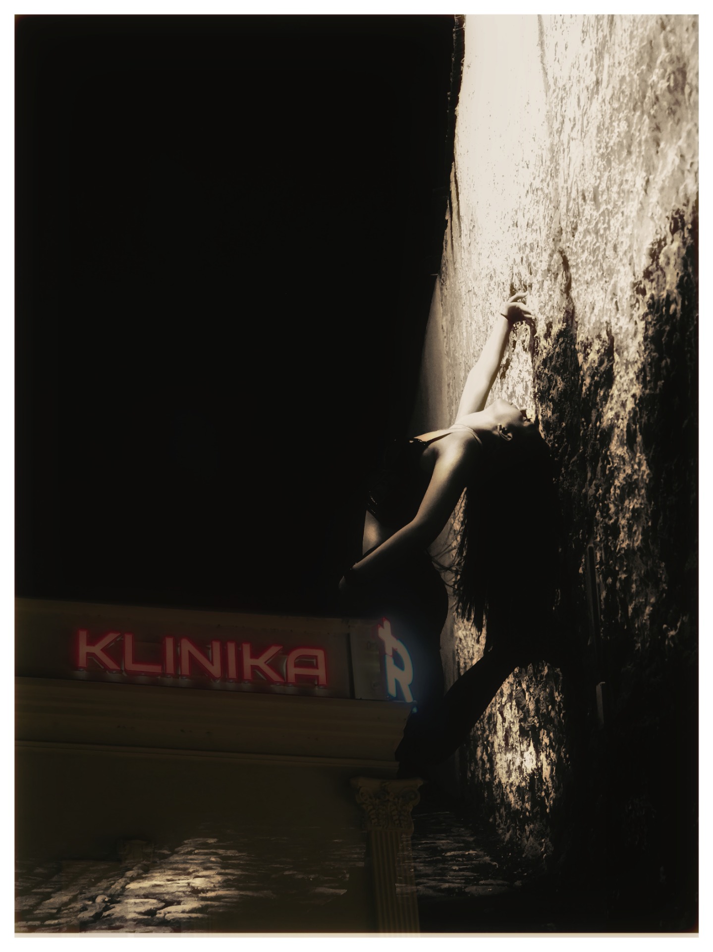 Pak se ale něco zlomilo. Procházeli jsme kolem neonu, který do noci neúprosně vykřikoval slovo "Klinika". Červené světlo nápisu se zakouslo do šedi s takovou intenzitou, že i ten nejstudenější stín najednou dostal barvu. Nebyl to prostor pro nemocné, byla to spíš příležitost. Možná výkřik. Stačilo se opřít o tu drsnou, historií nasvícenou omítku, zaklonit hlavu a nechat město, aby vám skrze ten neonový puls vpíchlo do žil obnaženého těla trochu toho čistého, nefalšovaného života. V tu chvíli nešlo o kompozici, ale o katarzi. Napětí spadlo z ramen jako letité dlažební kostky a zbyla jen čistá existence pod chladným světlem bohapustého nápisu.