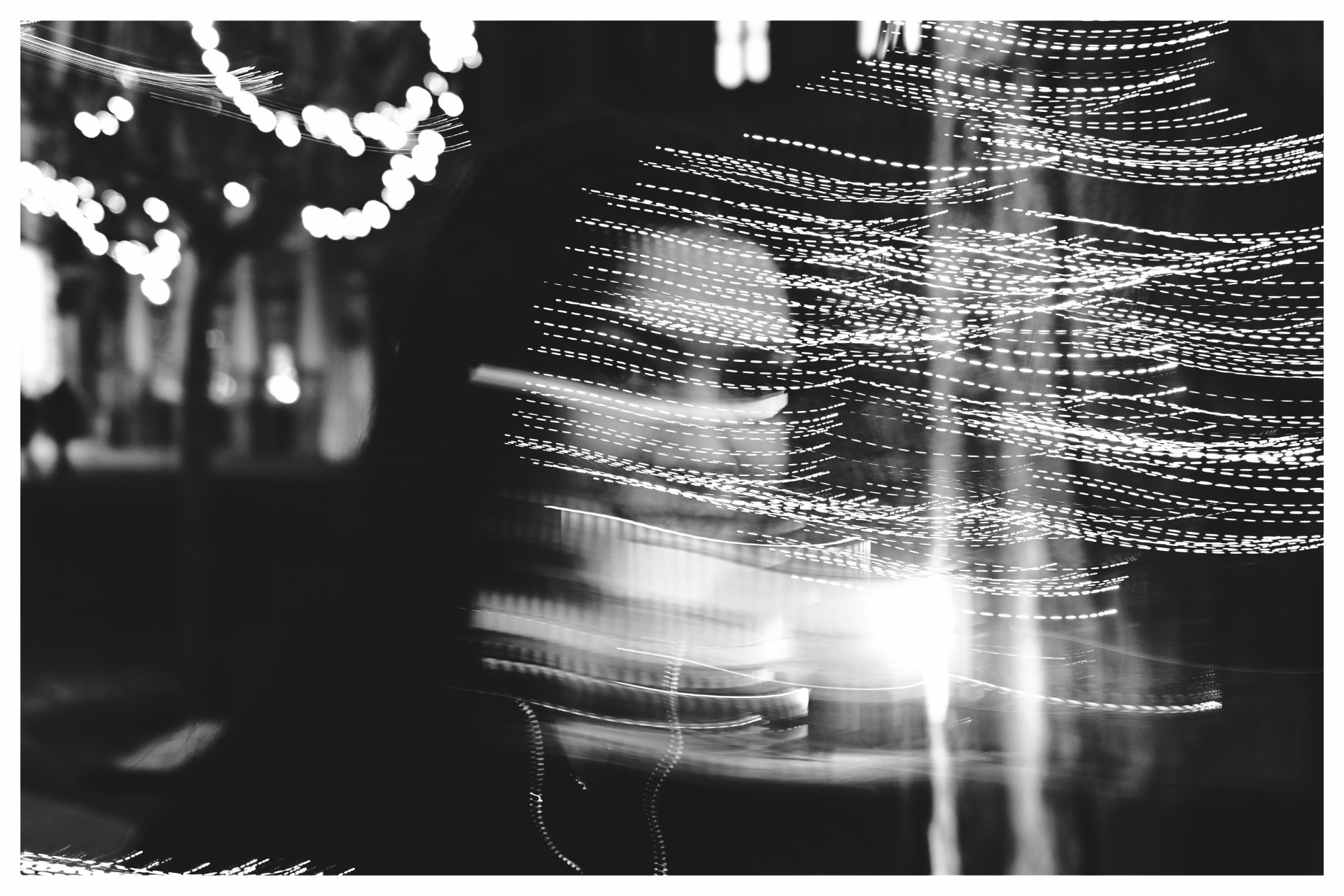 Nakonec se i ta Klinika ztratila v dálce. Zůstali jsme jen my a světlo, které se utrhlo ze řetězu. Město se proměnilo v abstraktní šmouhy každodennosti a lhostejnosti, aby je mohly bílé čáry rozřezat, stejně jako tu všeobjímající tmu. Všechno stejně vážné a těžké jako zbytečné se najednou rozplynulo v pohybu těla a světla. Najednou byl čas a prostor se smát. Ne snad proto, že by věci dávaly smysl, ale proto, že v tom chaosu světelných stop a otevřené závěrky bylo konečně místo pro radost. Noc nás přestala tížit a stala se hřištěm.